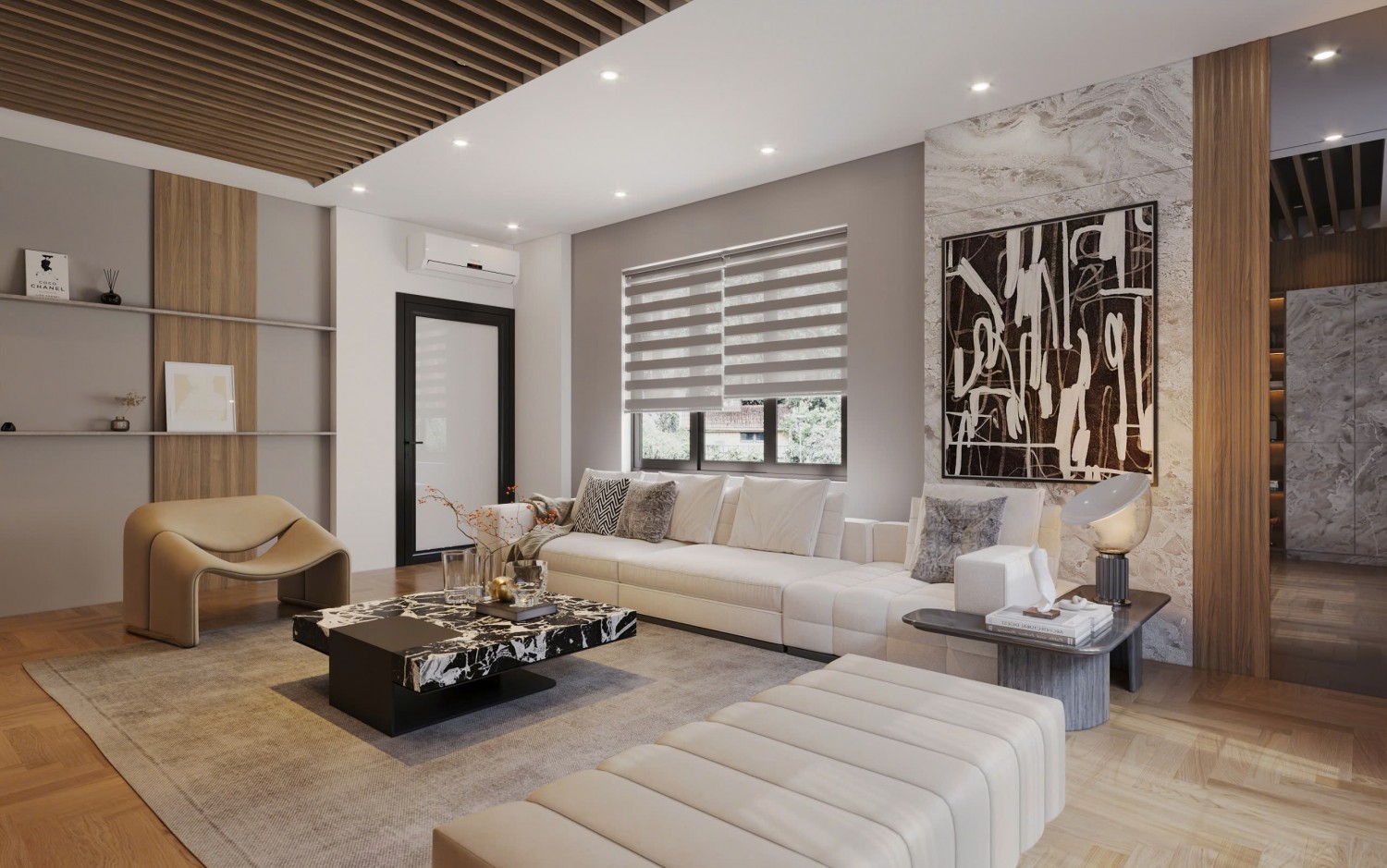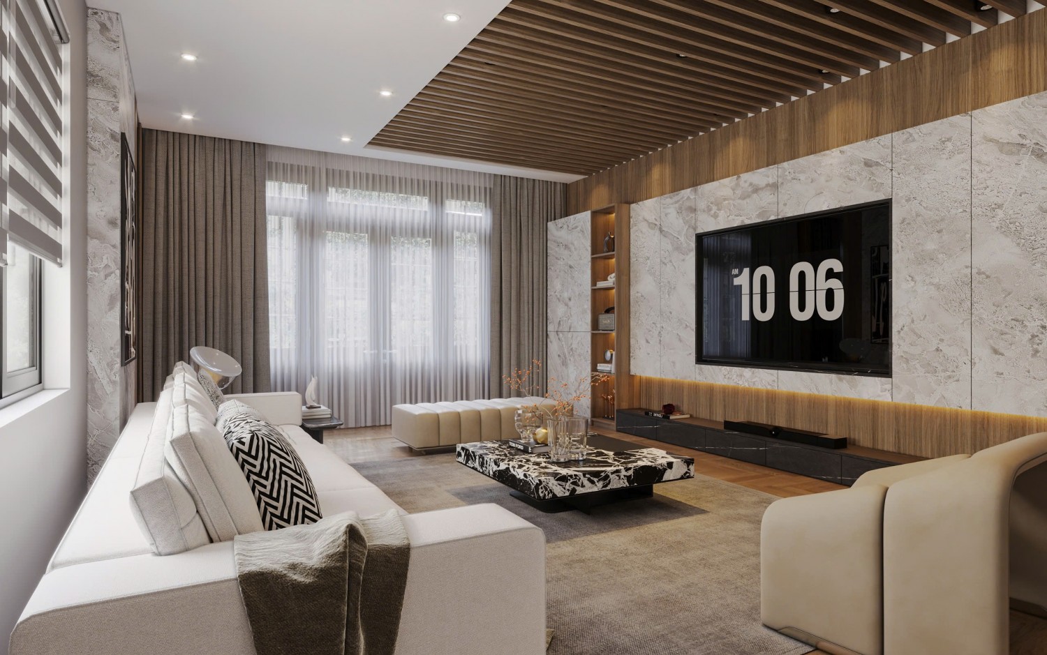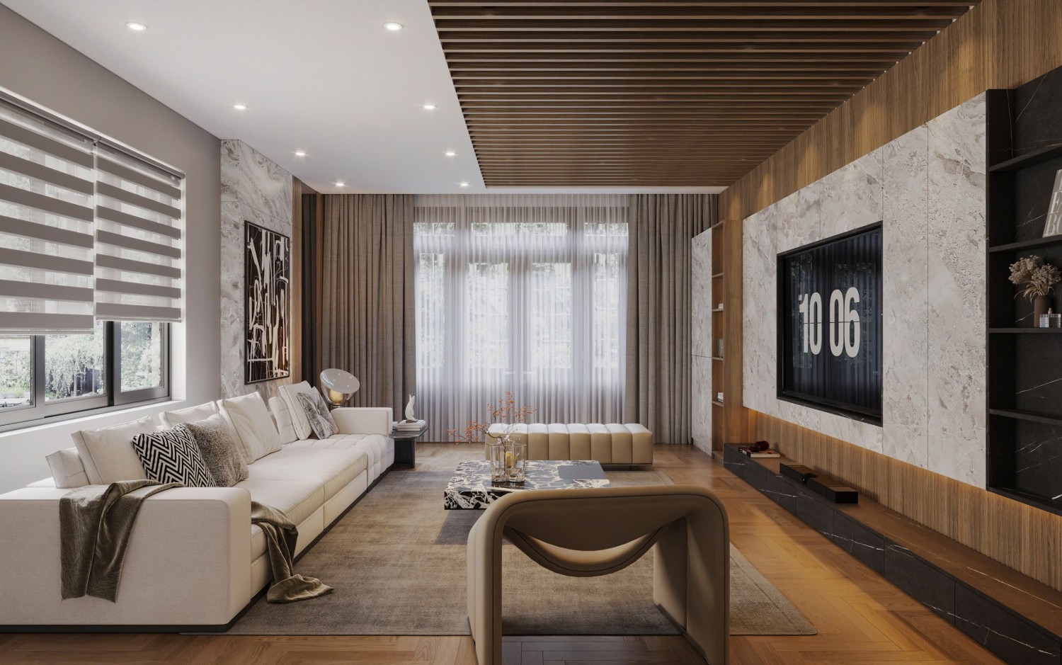 Căn phòng khách này mang đậm phong cách hiện đại, sang trọng với sự kết hợp hài hòa giữa màu sắc trung tính và các vật liệu cao cấp. Tổng thể không gian được thiết kế mở, tối ưu ánh sáng tự nhiên qua cửa sổ lớn được che bằng rèm vải dài mềm mại.