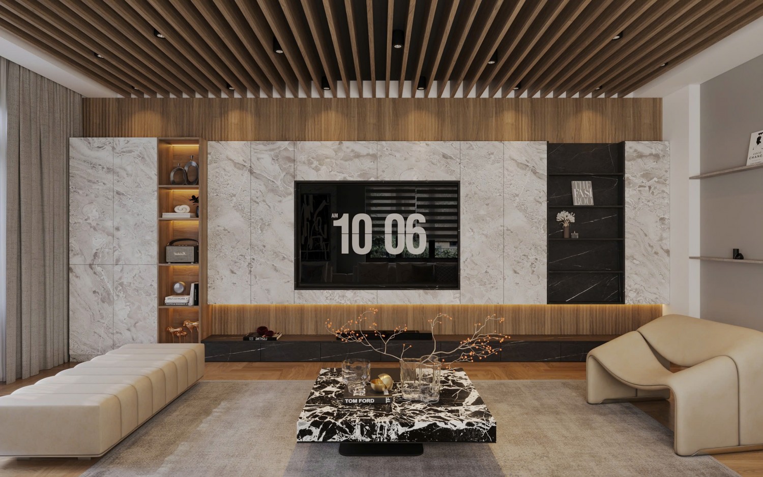 Trần nhà có thiết kế đặc biệt với sự kết hợp giữa trần thạch cao trắng và các thanh gỗ chạy song song, tạo chiều sâu cho không gian. Hệ thống đèn âm trần được bố trí hợp lý giúp cung cấp ánh sáng dịu nhẹ, tăng tính thẩm mỹ.